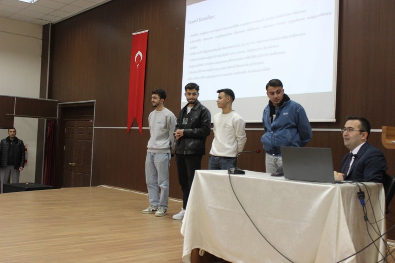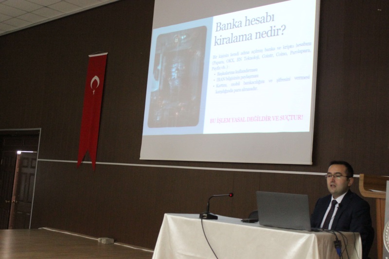 Bolvadin Cumhuriyet Başsavcısı Sayın Ümit Güntürk'ün sunumunda başta "IBAN Kullandırma" olmak üzere çeşitli dijital dolandırıcılık yöntemleri hakkında ayrıntılı bilgilendirme yapılan etkinliğe; Meslek Yüksekokulu Müdürü Prof. Dr. Hüseyin Bayrakçeken ve okul yönetimi, Bolvadin Uygulamalı Bilimler Fakültesi Dekan Yardımcısı Doç. Dr. Münevvere Yıldız, yüksekokul akademik ve idari personeli ile yaklaşık 400 öğrenci katıldı.